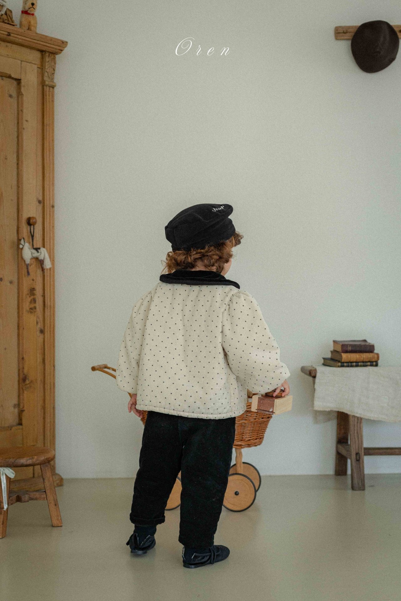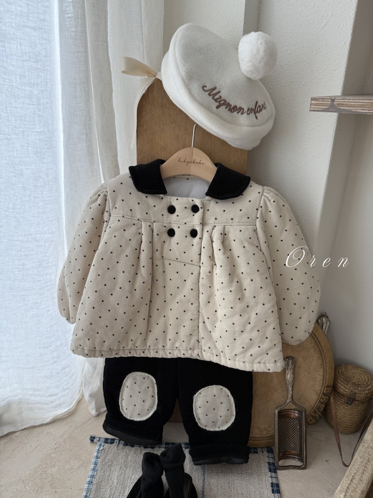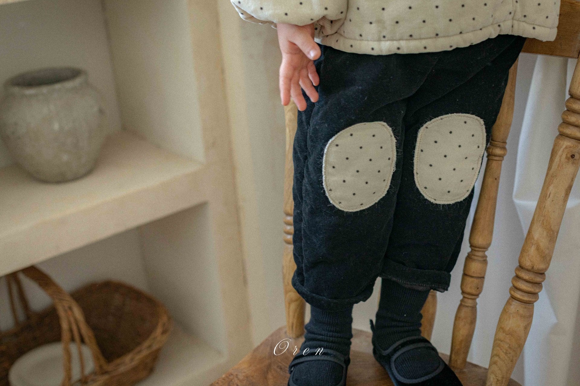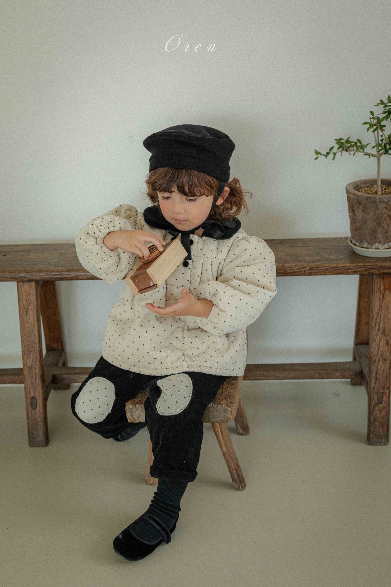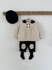 トップスのダブルボタンのディテールとブラックカラーの装飾が、クラシカルなムードをプラスします。パンツは膝部分にドット生地のパッチポイントをあしらい、子供服ならではの活気と可愛さを同時に表現しています。