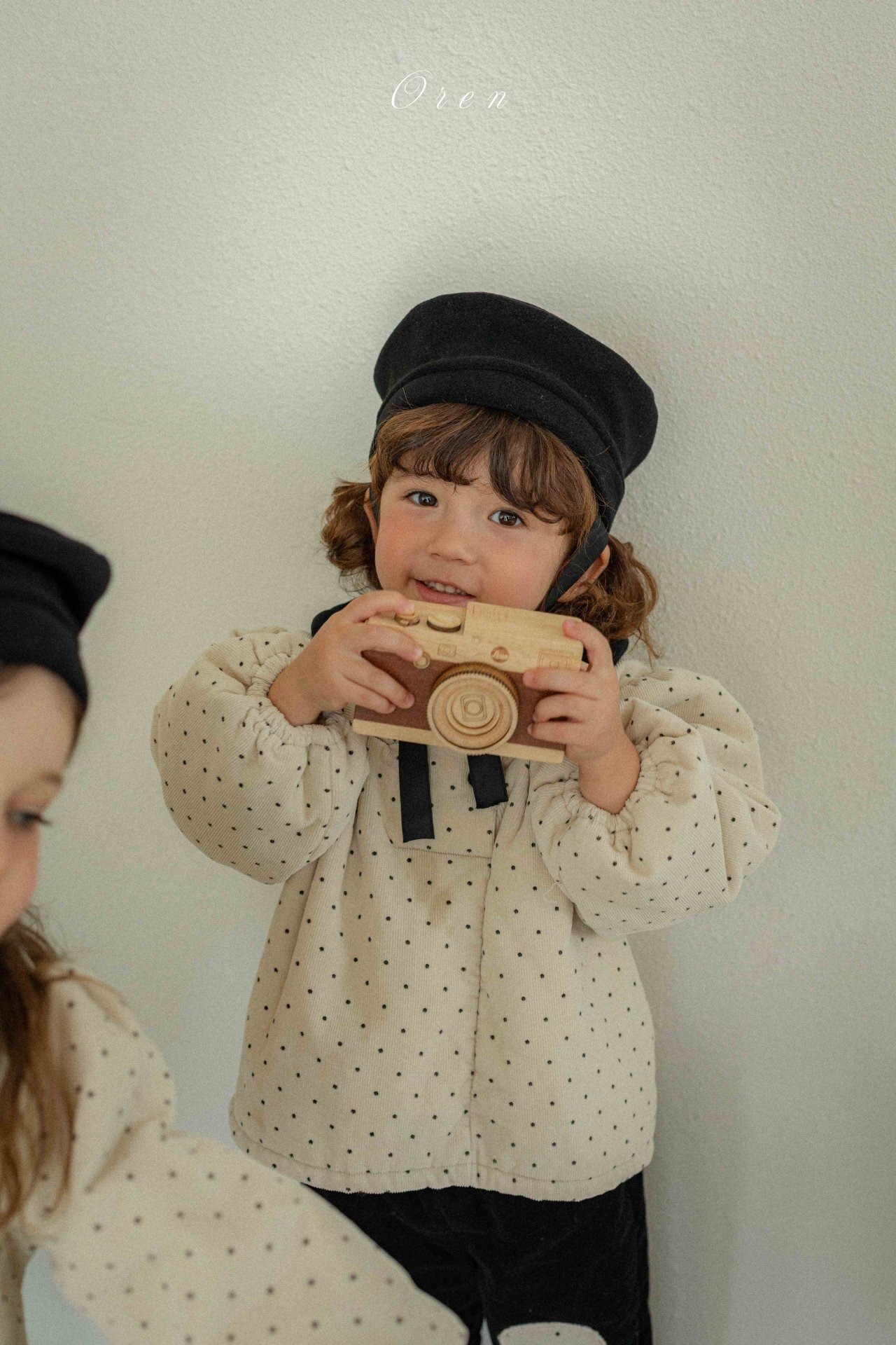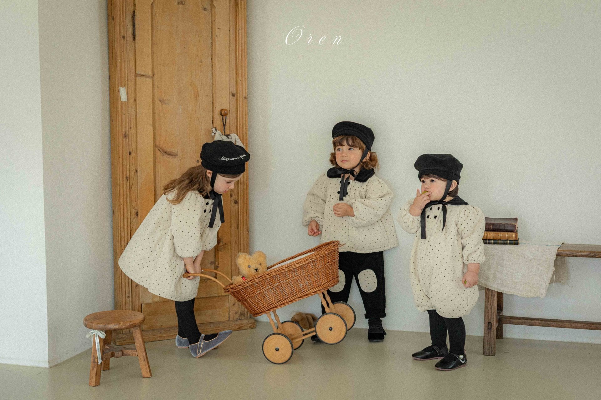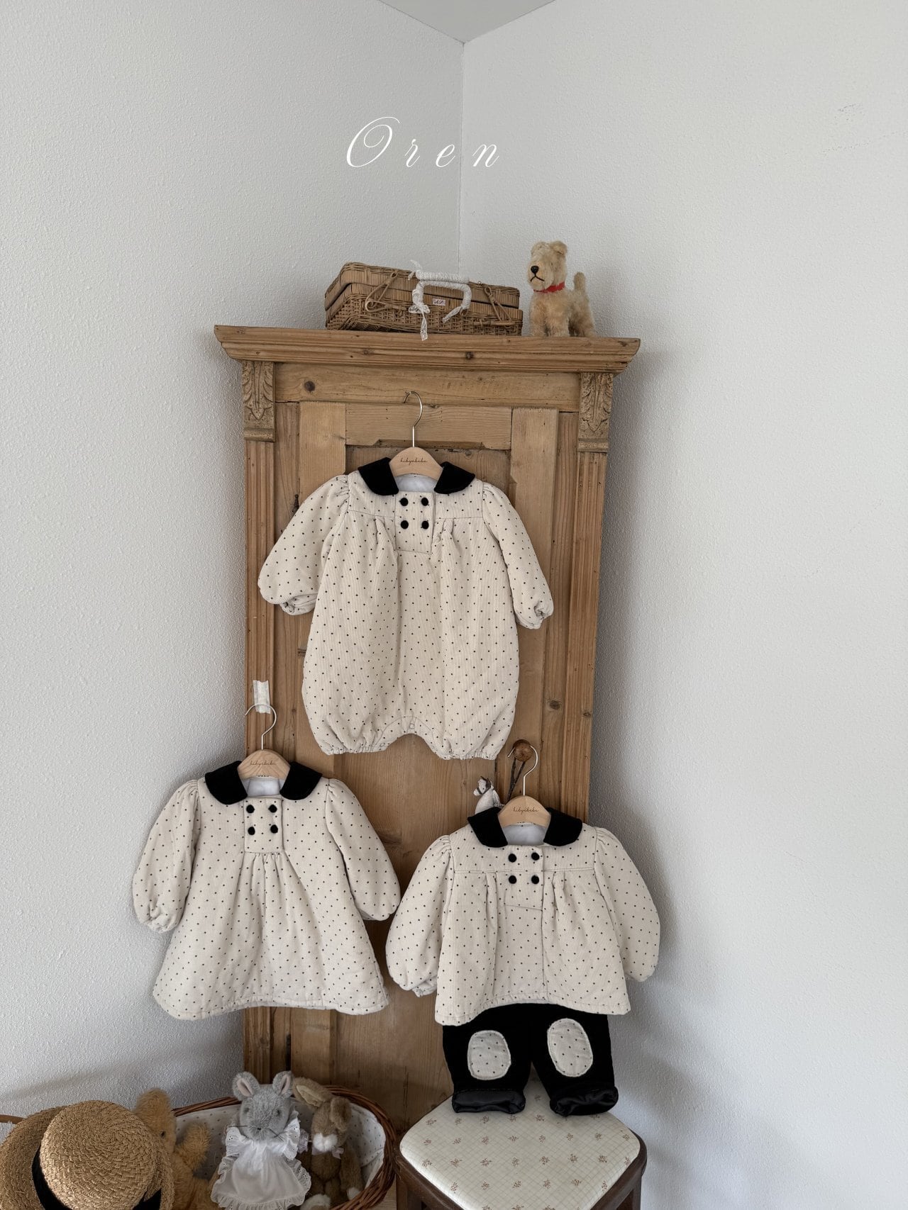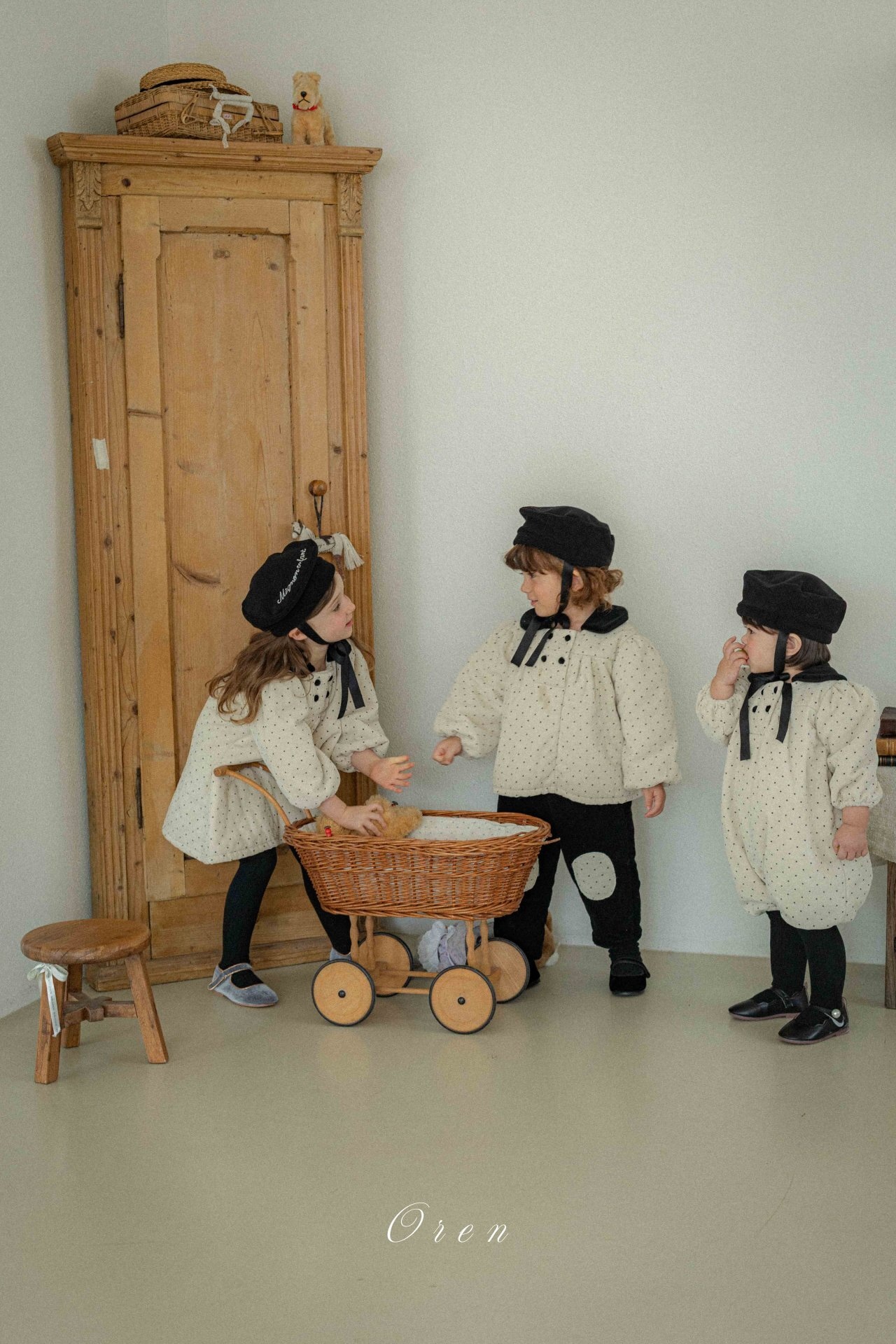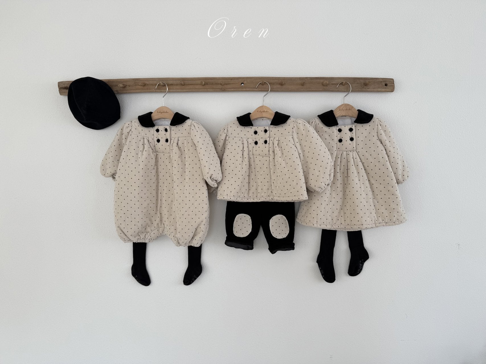 トップスのダブルボタンのディテールとブラックカラーの装飾が、クラシカルなムードをプラスします。パンツは膝部分にドット生地のパッチポイントをあしらい、子供服ならではの活気と可愛さを同時に表現しています。