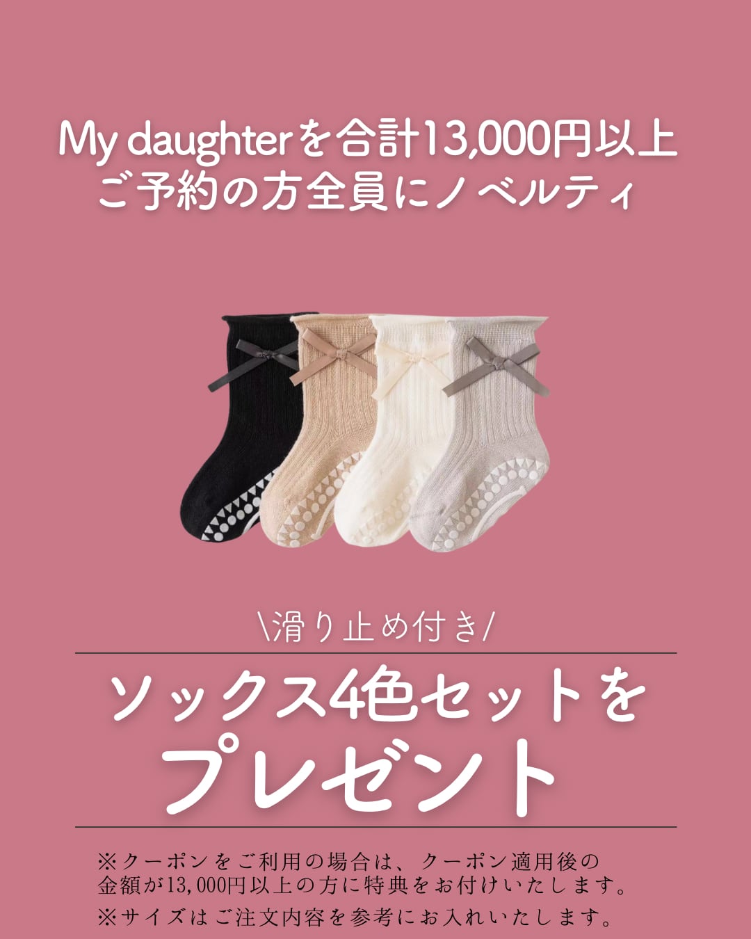 ノベルティとして、ベビーに嬉しい滑り止め付き【ソックス4色セット】をプレゼントいたします!