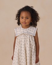 美しくギャザーを寄せたフルスカートと、チャーミングなセーラースタイルのビブカラーが、ヴィンテージ感を演出します。